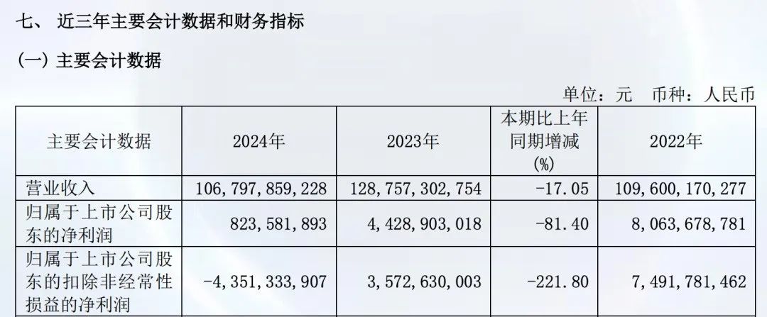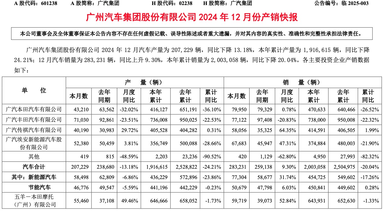 3月28日发布的年报显示,2024年,广汽集团全年实现汽车销量200.31万辆,同比下降20.04%。其中自主品牌板块实现销量78.95万辆,同比下降10.95%。2024年营业总收入1077.84亿元,同比下降16.9%;归母净利润8.24亿元,同比下降81.4%;扣非净利润-43.51亿元,同比下降221.8%。